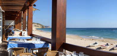 Salema in the Western Algarve, Portugal. Expats drinking wine, naked babies playing on the beach. Boia Bar Ristorante on the sand. Pouring piri-piri sauce over grilled fish.